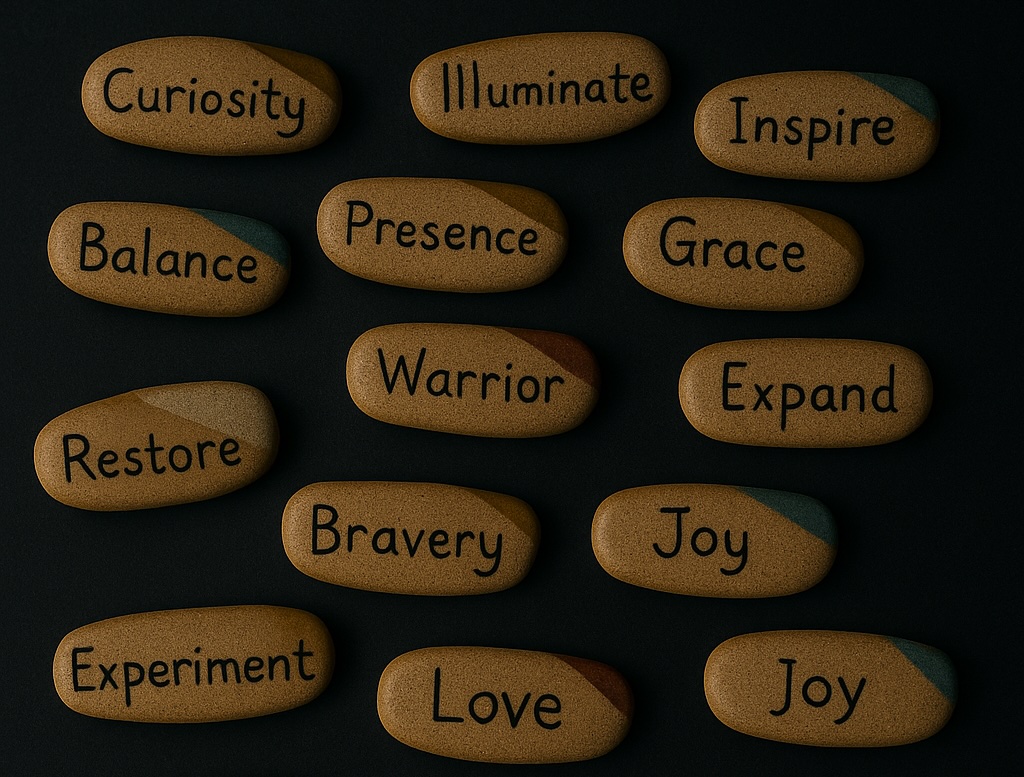 These tactile stones are designed to anchor your intentions and reconnect you to what matters. Each one is engraved with a single powerful word—a daily invitation to centre your leadership in presence, purpose, and courage.